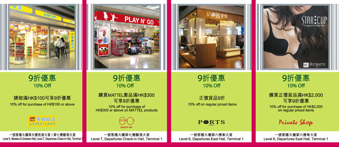 上述各優惠只適用於香港國際機場一號及二號客運大樓。如有任何查詢,請直接與各商鋪聯絡。