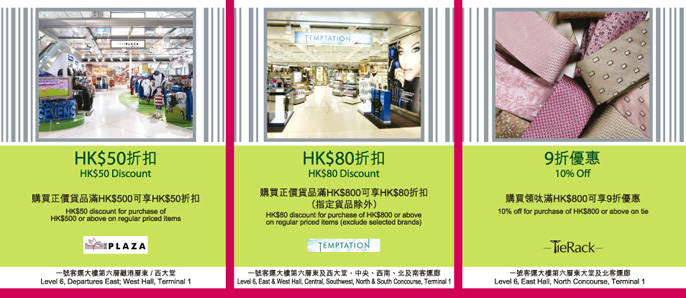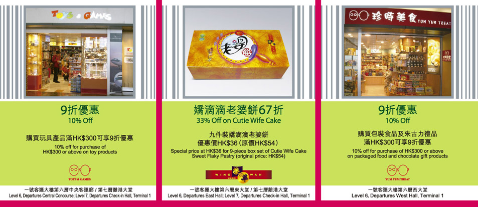 上述各優惠只適用於香港國際機場一號及二號客運大樓。如有任何查詢,請直接與各商鋪聯絡。