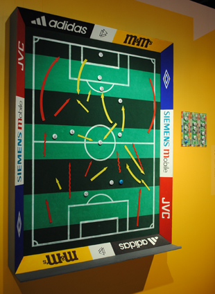 Please make use of the painting elements like play figures, arrows, and lines to draw your own tactics on the board combined by football course and advertisement.